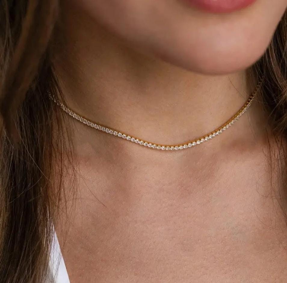 Elevate your style with the Golden Grace Tennis Necklace, a timeless piece featuring a sleek line of dazzling cubic zirconia set on a golden base. Its refined sparkle and minimalist elegance make it the perfect choice for both everyday wear and special occasions.