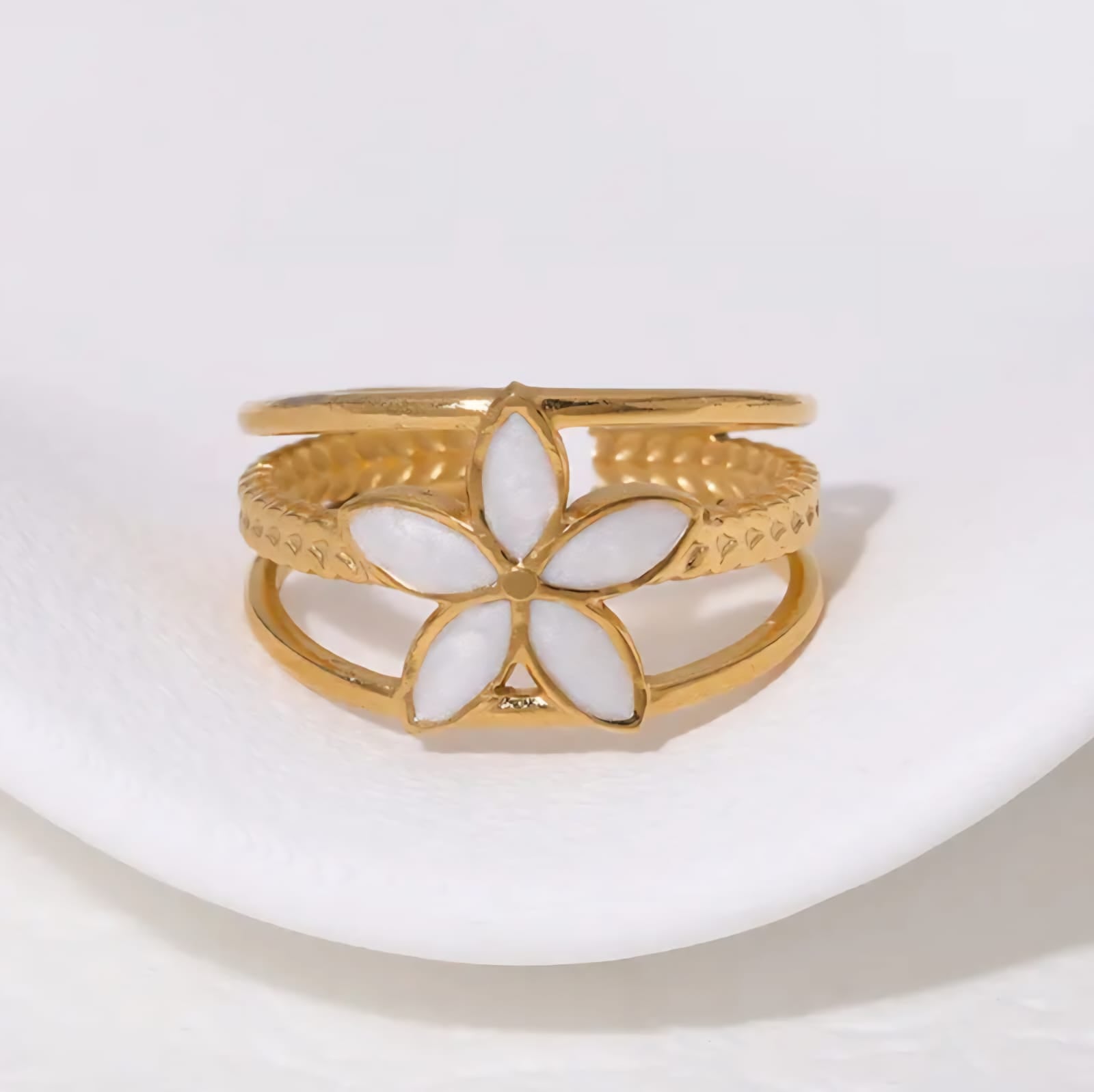 A modern classic that stands out effortlessly. This wide-band ring features a smooth white enamel finish framed with radiant gold edges, creating a bold yet sophisticated look. Crafted with a durable anti-tarnish and waterproof finish, it’s designed for comfort, style, and everyday wear. Perfect for wearing solo as a statement piece or pairing with minimal bands for a chic stacked look.